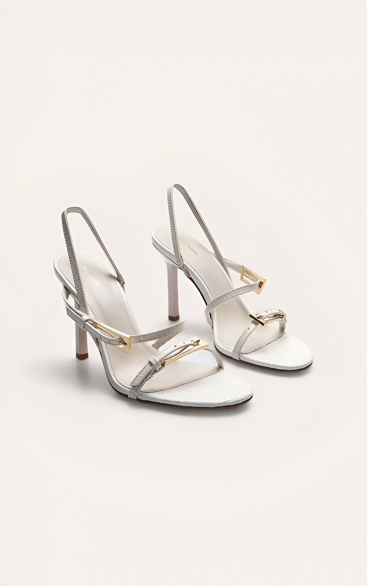 Black Buckle Asymmetric Strap Round Toe Heeled Sandals