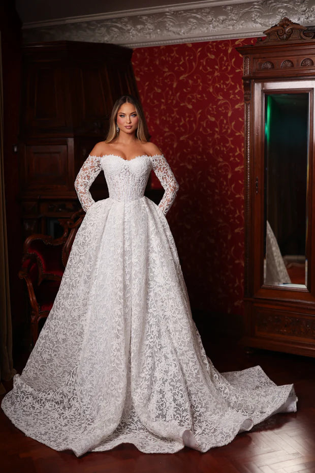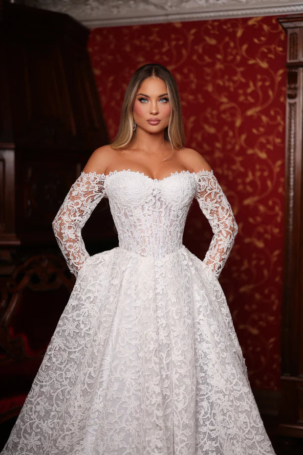 Elegant bridal veil crafted from delicate lace with refined floral details. The off-shoulder design with lace sleeves creates a romantic and timeless silhouette, perfect for brides seeking classic elegance and sophistication.
