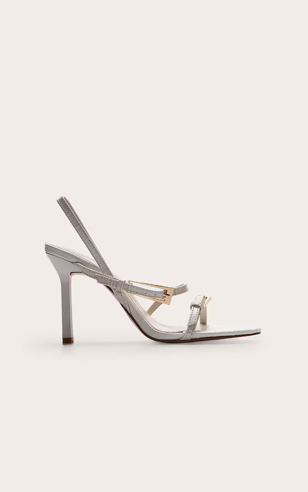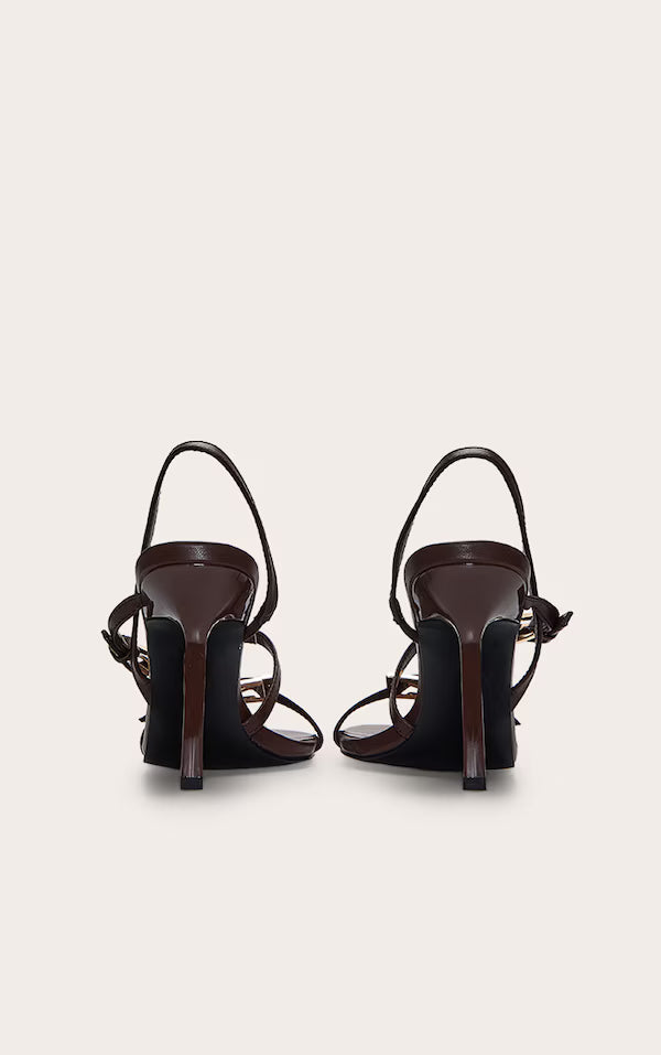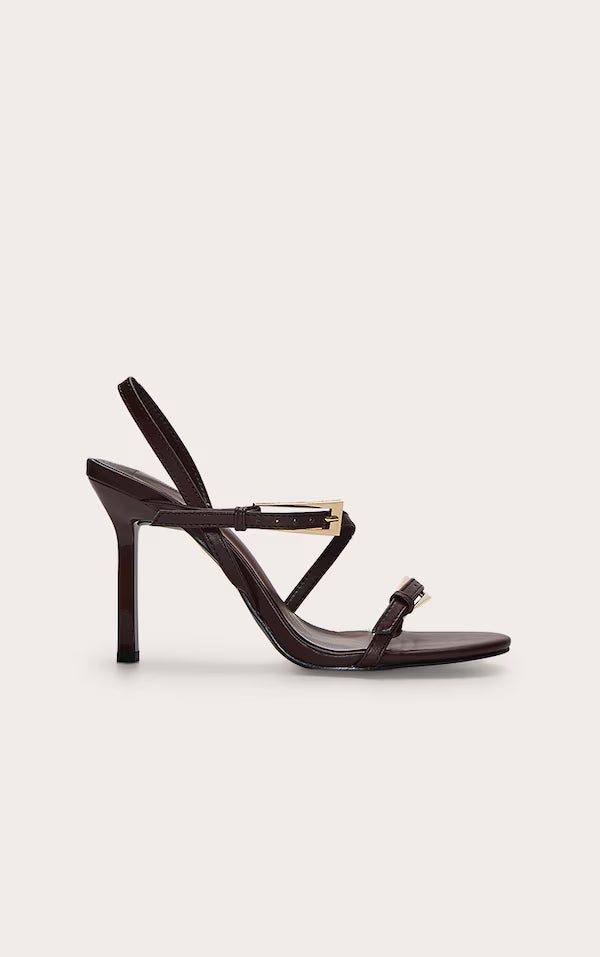 The perfect addition to any look, say hello to the black buckle asymmetric strap round tie heeled sandals. Crafted from black material, these shoes have a 4 inch stiletto heel, thin asymmetrical straps and buckle detailing with a rounded toe design. Pair them with any outfit for the perfect finishing touch.