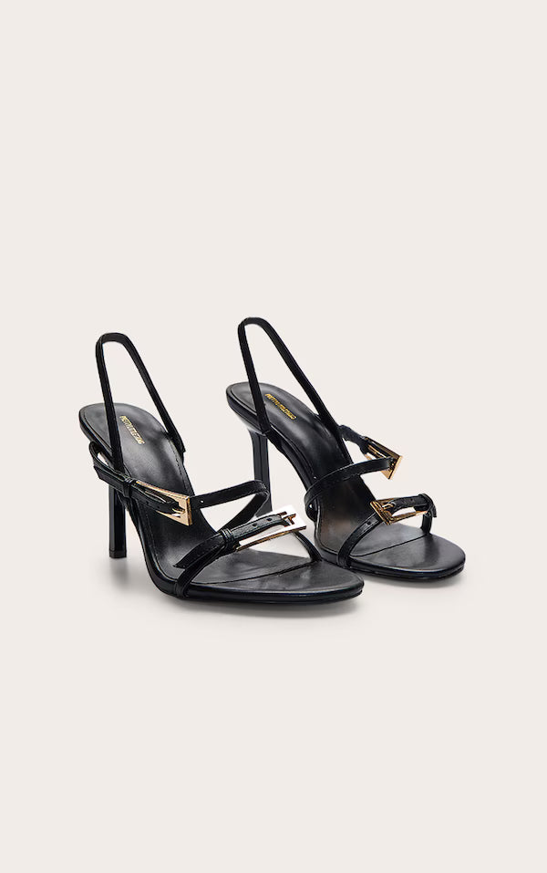 Black Buckle Asymmetric Strap Round Toe Heeled Sandals