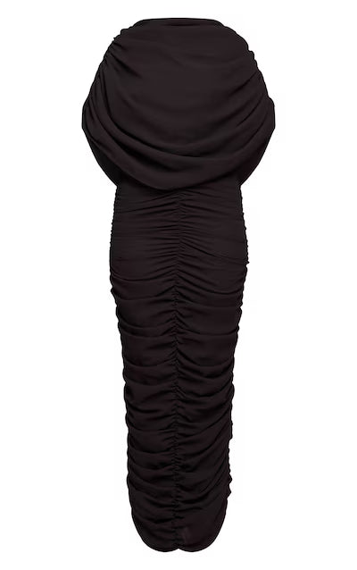 Own the spotlight with the black chiffon overlay detail ruched maxi dress. It features a striking chiffon overlay detail at the neckline, complementing its ruched bodycon silhouette. Perfect for that unmissable event on your calendar. Complete the look with subtle kitten heels and delicate pearl earrings.