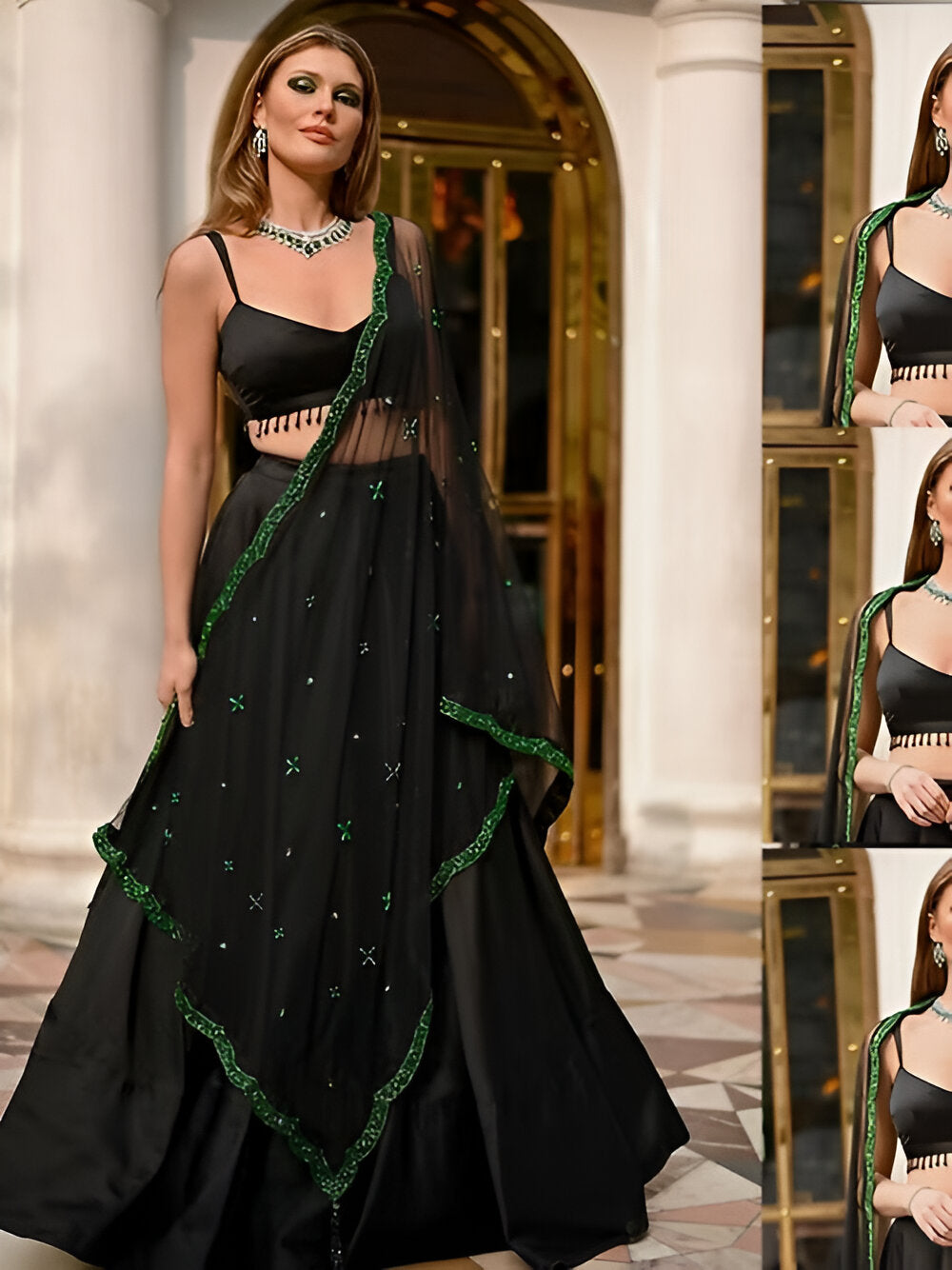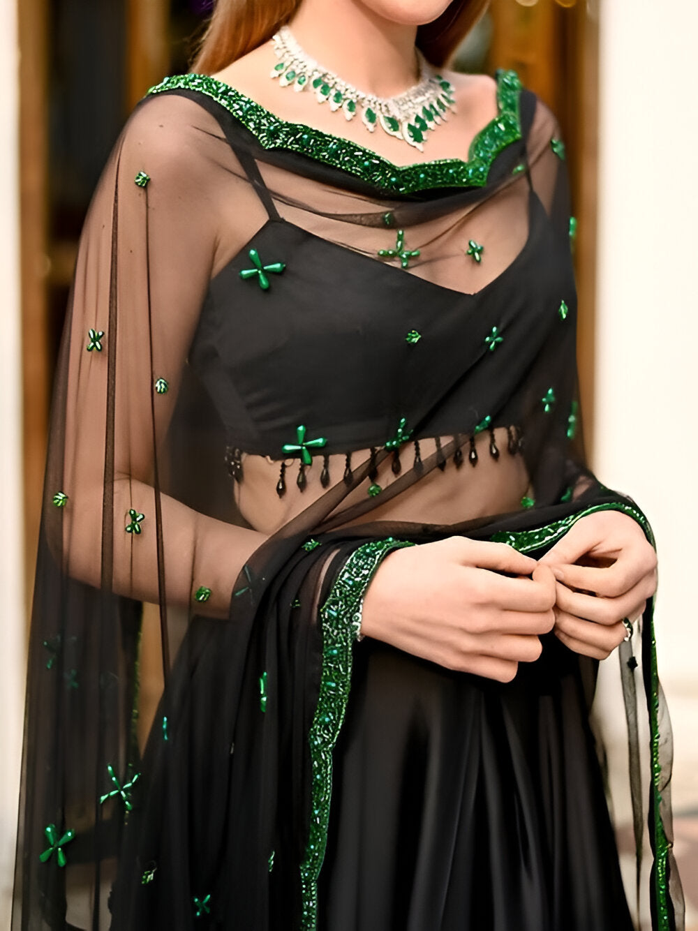 Black skirt in milano satin, black satin blouse with pearl drops, Net duppata hand embelished with green micro tube beads, crystals and seed beads.