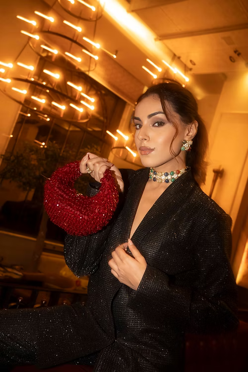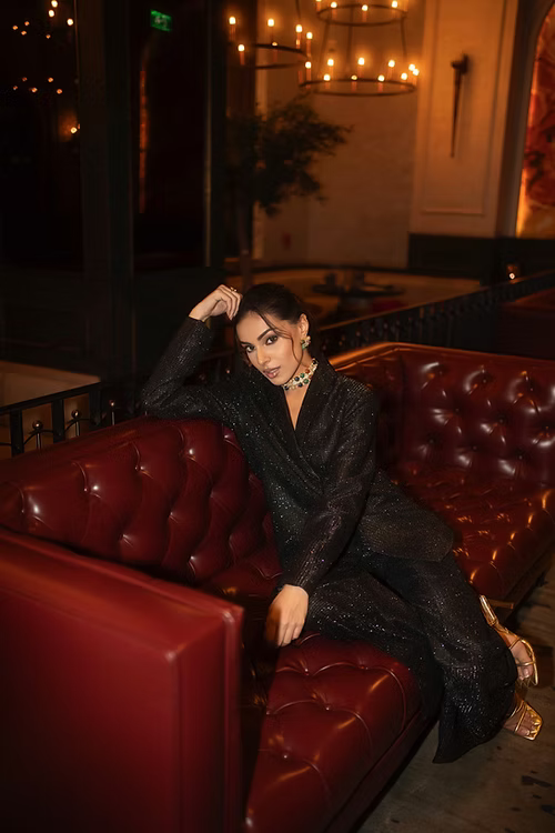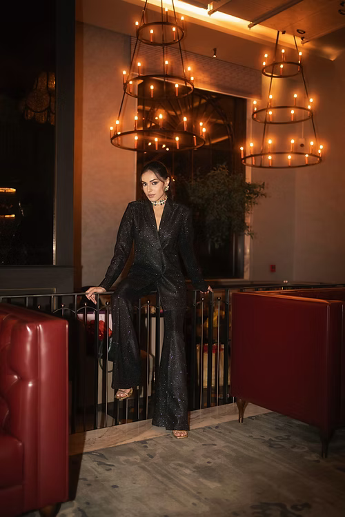Drenched in radiance, this handcrafted co-ord set is cut from a luxurious black shimmer fabric that catches the light with every move. Featuring a sharp, tailored blazer and fluid wide-leg trousers, this look is designed for bold, unforgettable entrances.