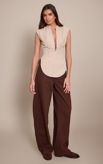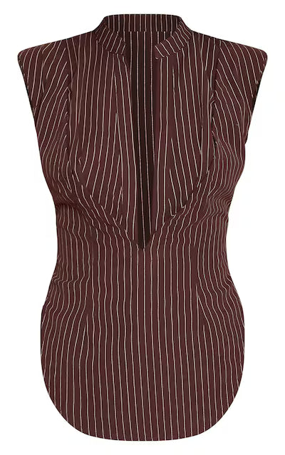 Perfect your evening style with this brown striped shoulder padded fitted sleeveless shirt. It features a distinctive deep V-neckline, a brown stripe design, a fitted cut, and structured padded shoulders. This shirt is perfect for making a statement at your next evening event. Pair with tailored trousers, sleek brown heels and striking gold earrings for a powerful look.