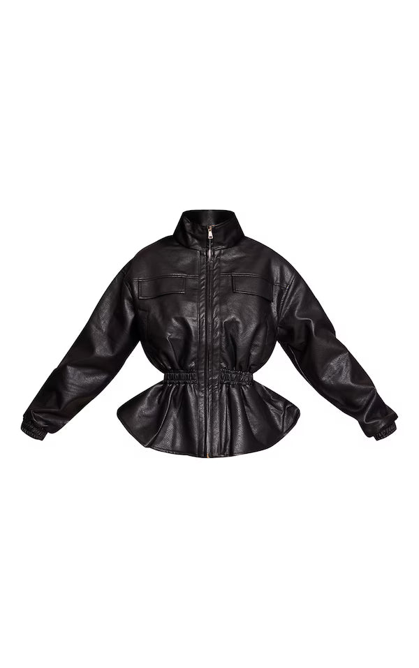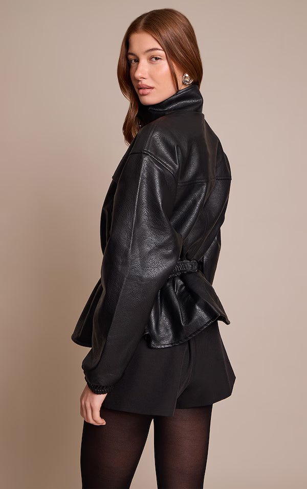 Chocolate Plum High Neck Cinched Waist Faux Leather Jacket