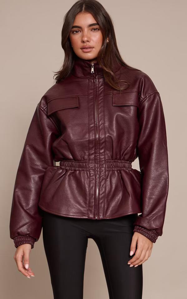Update your jacket collection with the statement-making chocolate plum high neck cinched waist faux leather jacket. Crafted from rich faux leather, this piece features an elevated high neck, practical zip fastening, and a contemporary cinched waist. It's the ultimate piece for elevated daytime styling, from city errands to chic lunch dates. Style with wide-leg trousers, sleek mid calf boots, and subtle drop earrings for a look that means business.