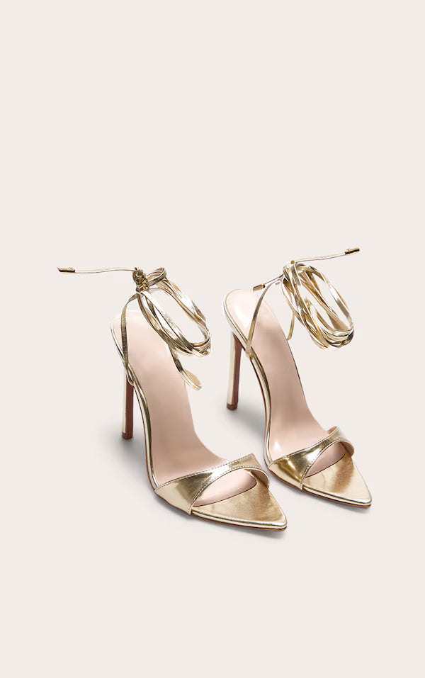 Gold PU Point Toe High Heeled Lace Up Sandals
