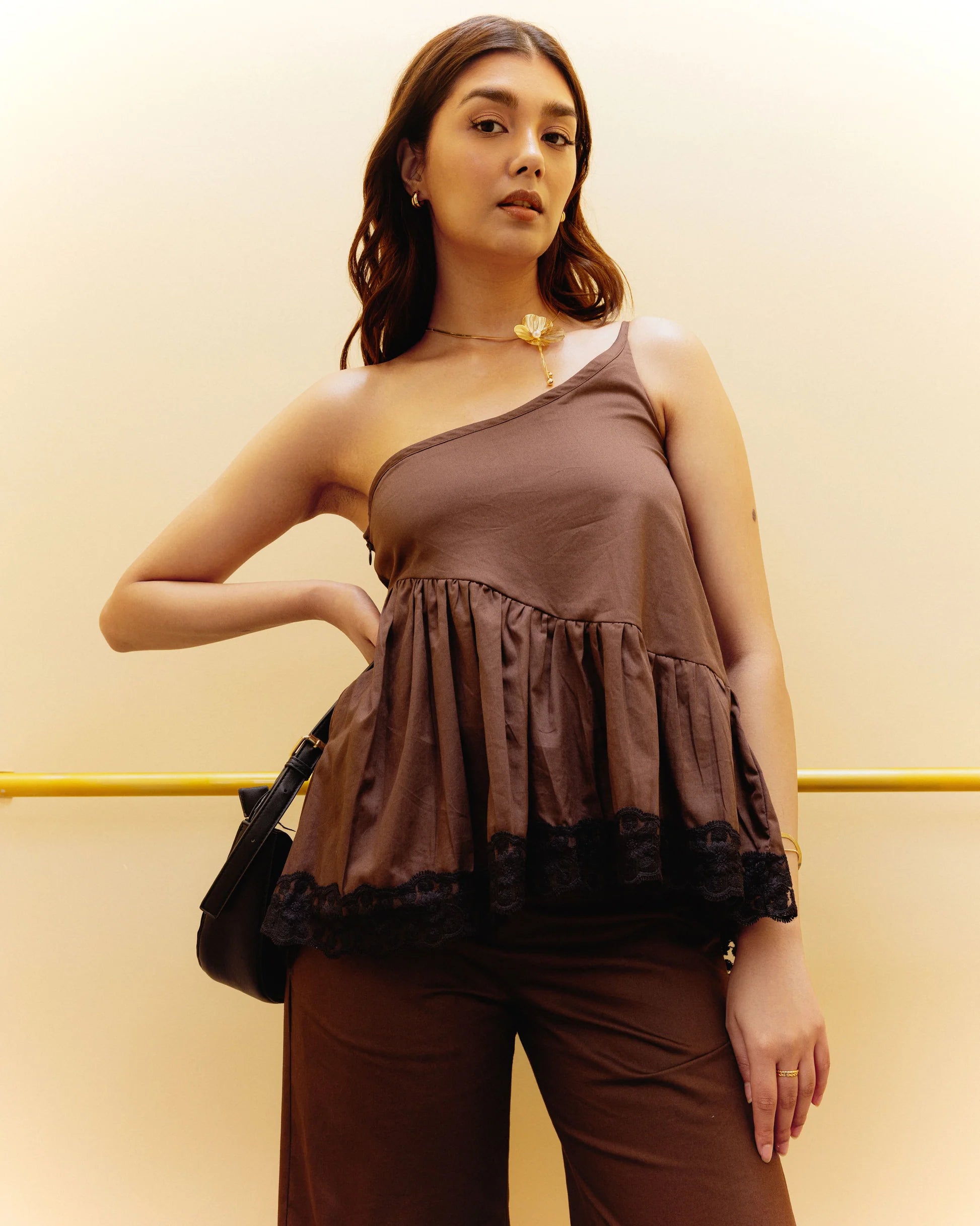 This deep dark-brown top features a one-shoulder spaghetti strap with delicate black lace edge. It’s the perfect blend of daring and easygoing—made for those moments when you’re sipping, savouring, and sneaking a little me-time.