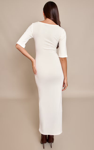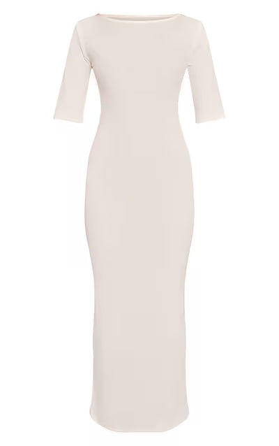 Define your everyday aesthetic with this cream boat neck short sleeve maxi dress. This cream bodycon piece boasts a classic boat neck, short sleeves, and a sleek maxi length. It’s perfect for styled brunches or relaxed day events on your calendar. Complete the look with sophisticated ankle boots and subtle gold jewellery for a refined aesthetic.