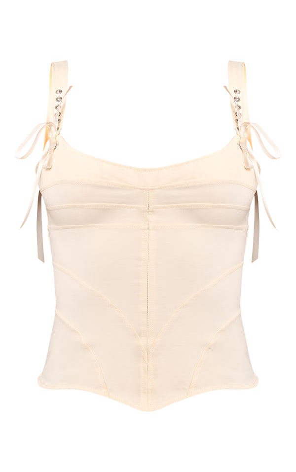 Define your evening aesthetic with an artful edge. This cream peachskin eyelet detail corset brings a refined silhouette to your after-dark wardrobe, featuring delicate tie-shoulder straps with subtle eyelet detailing and structural seaming that sculpts the form. Pair it with high-waisted tailored trousers for a sleek, confident look or a flowing midi skirt for an elevated ensemble, completing your vision with statement gold jewellery and sharp stiletto heels.