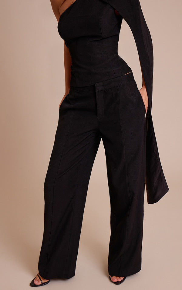 Fit: Structured bandeau top with cape detail and wide-leg trousers