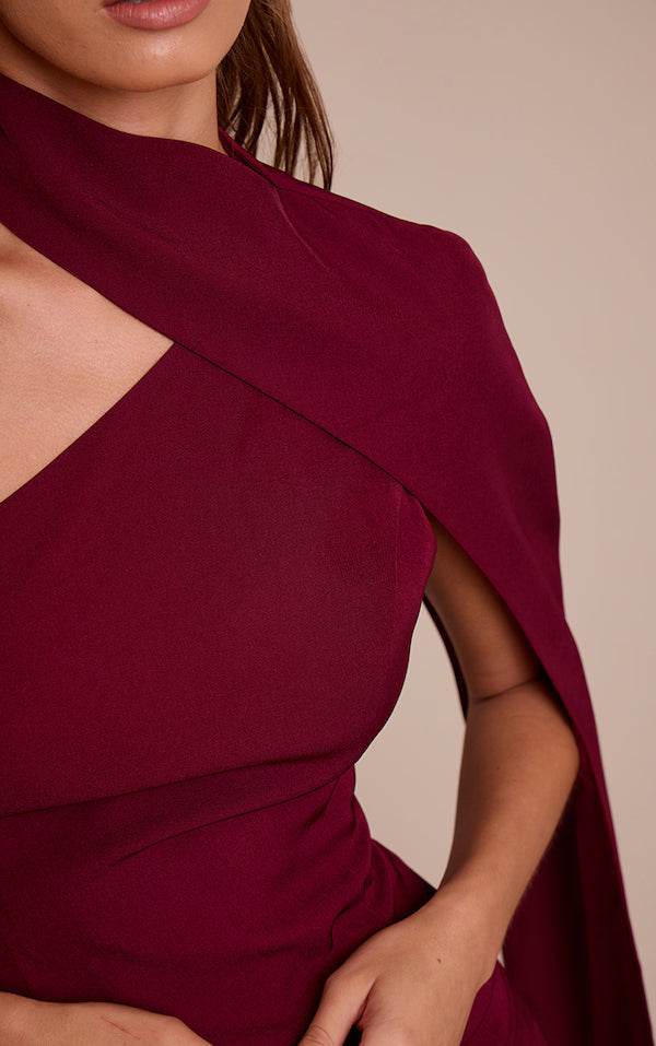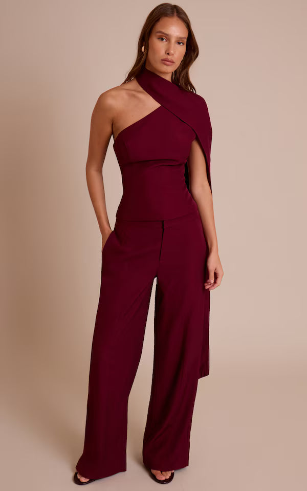 Make a powerful statement with the Tailored Woven Shoulder Cape Top and Trousers set. Crafted in a luxurious tailored woven fabric with a rich wine hue, this co-ord brings elegance and sophistication to any occasion. The bandeau top features a dramatic shoulder cape that adds structure and flair, while the matching wide-leg trousers are designed with subtle seam detailing for a sleek, polished finish.