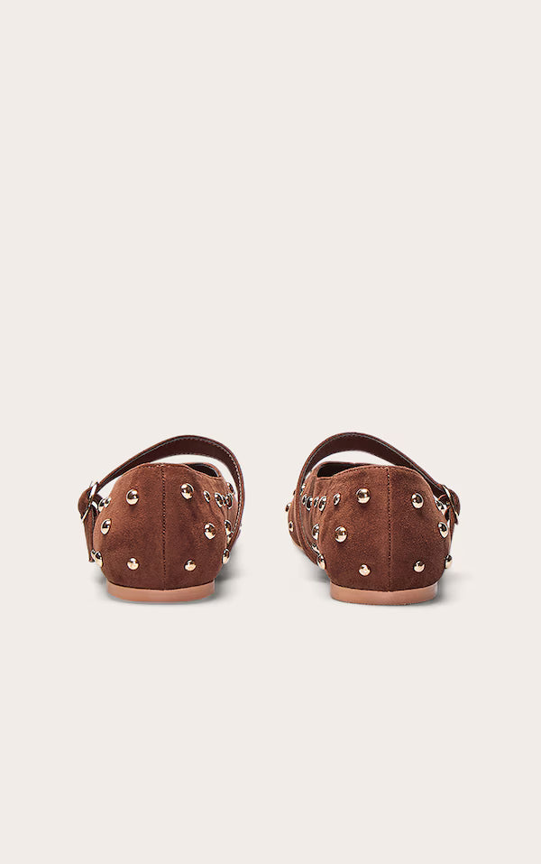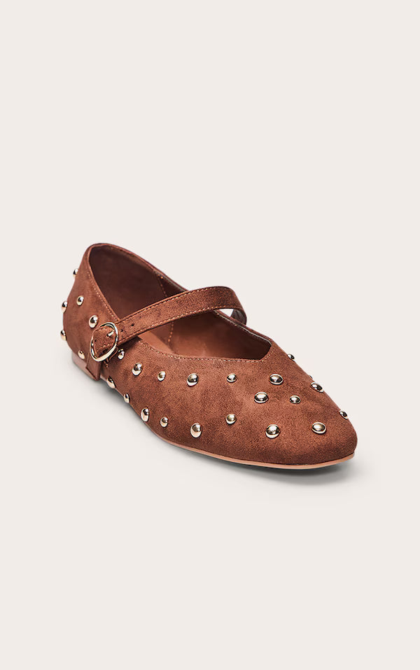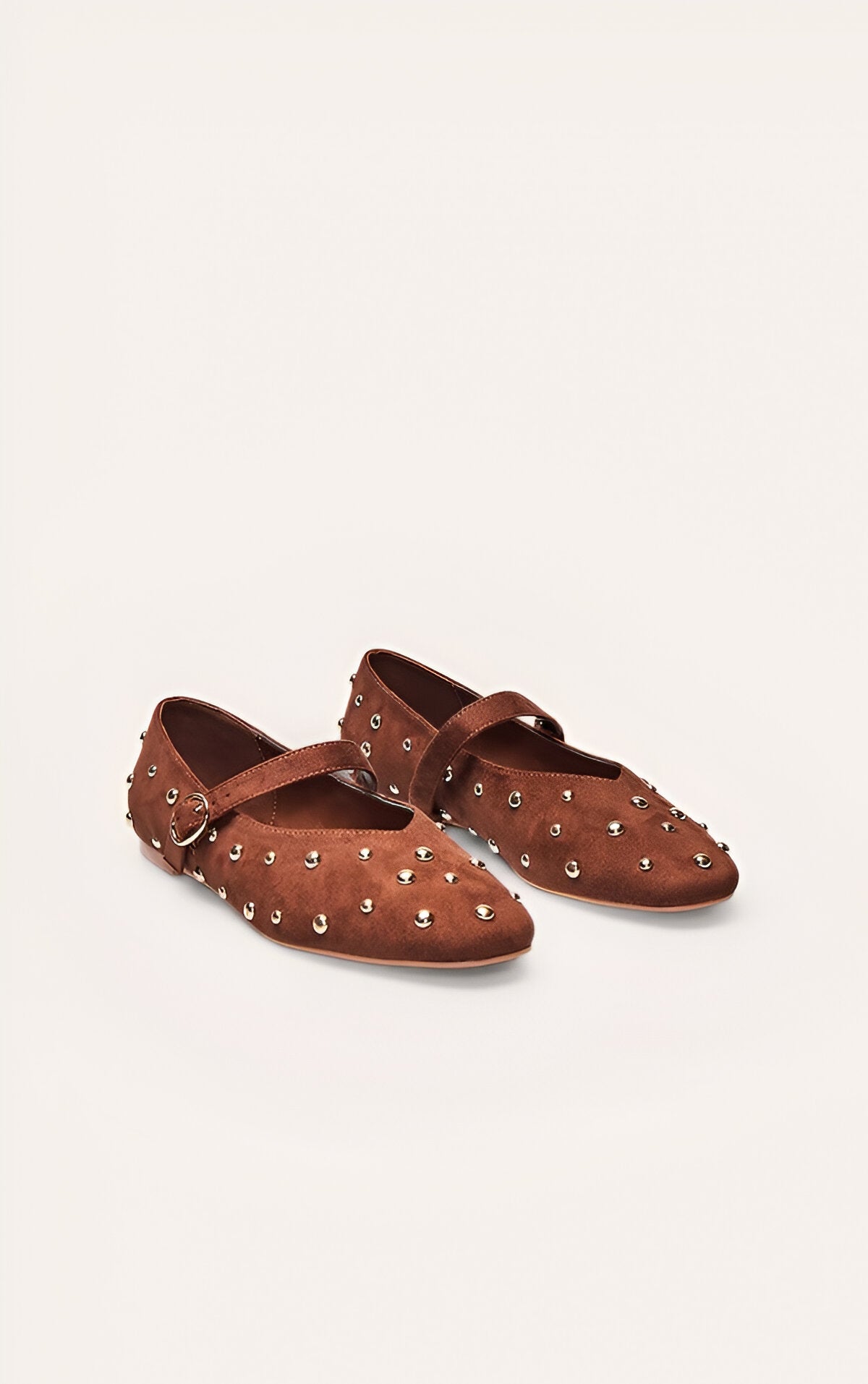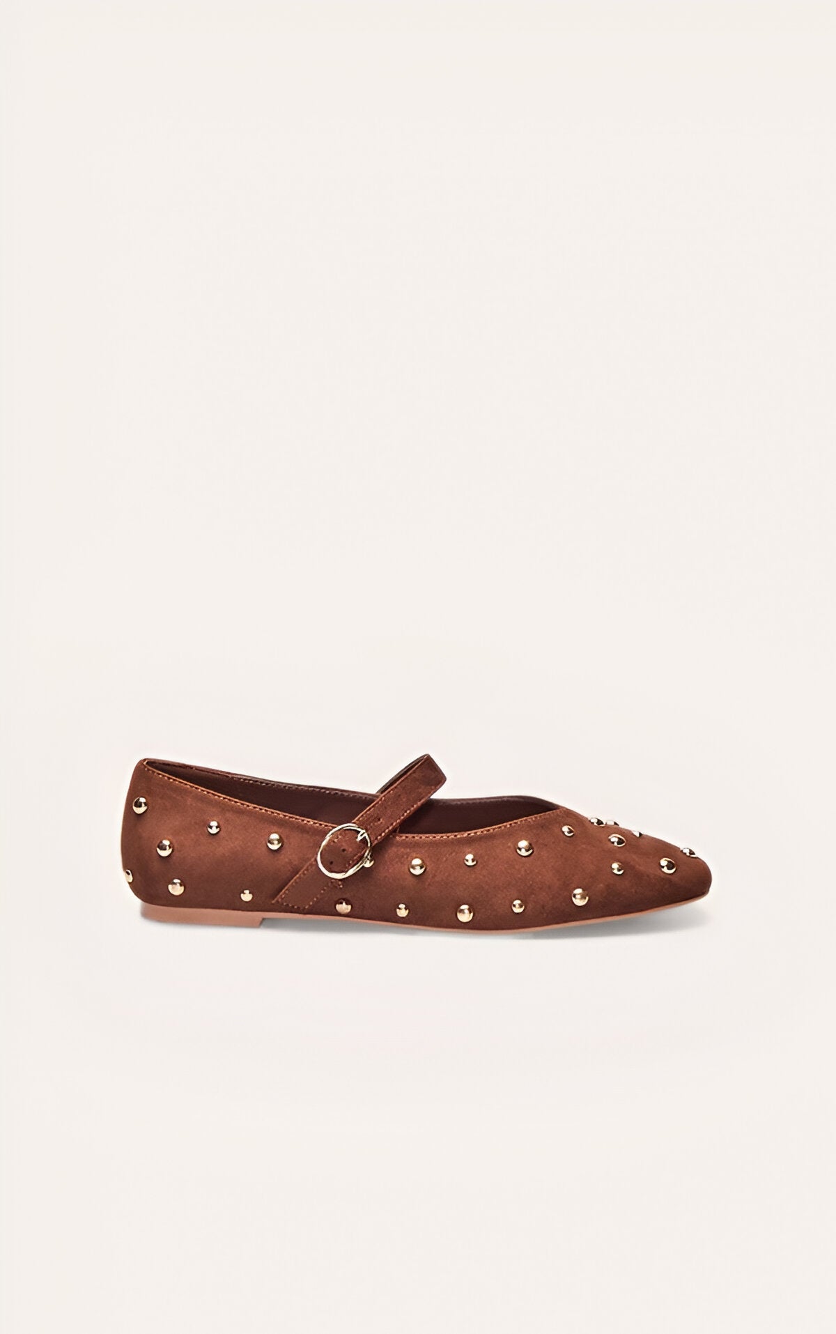 Step up your footwear game with the black leather ballet pump with stud detail. These sleek ballet pumps are crafted from faux leather and feature metallic stud accents for an edgy twist on a classic. Wear them with tailored trousers or a midi skirt for a look that’s both sharp and feminine.