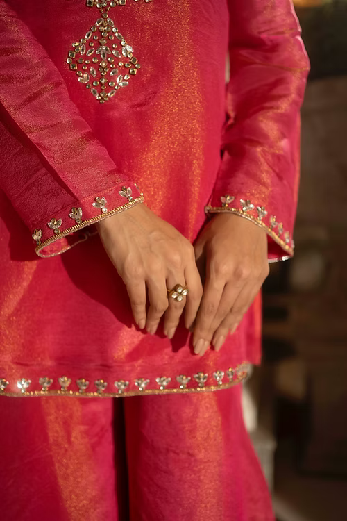 Radiate elegance in this electric pink tissue gharara set, a timeless blend of traditional craftsmanship and contemporary style. The richly textured tissue fabric catches the light with every movement, enhancing the outfit’s luxurious appeal.