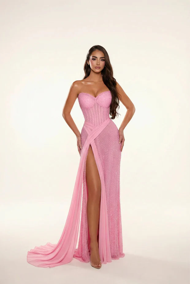 A refined pink evening gown featuring a structured corset bodice, delicate shimmer, and a flowing draped slit