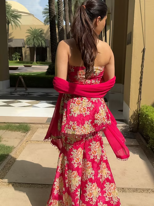 Make a bold statement in our Fuchsia Bloom Gharara Set, featuring a vibrant highlighter floral print in a silhouette that blends traditional elegance with modern flair.