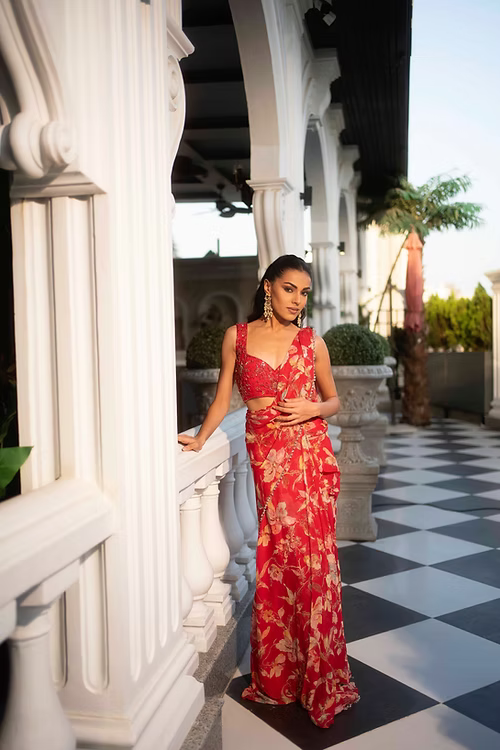 A striking fuschia pink printed georgette pre-draped saree, adorned with delicate floral motifs that exude elegance. Paired with a hand-embroidered blouse embellished with intricate crystal and beadwork, this ensemble beautifully balances tradition with contemporary flair. The saree and blouse are further enhanced with crystal accents, adding a touch of shimmer and sophistication—perfect for festive celebrations or evening occasions.
