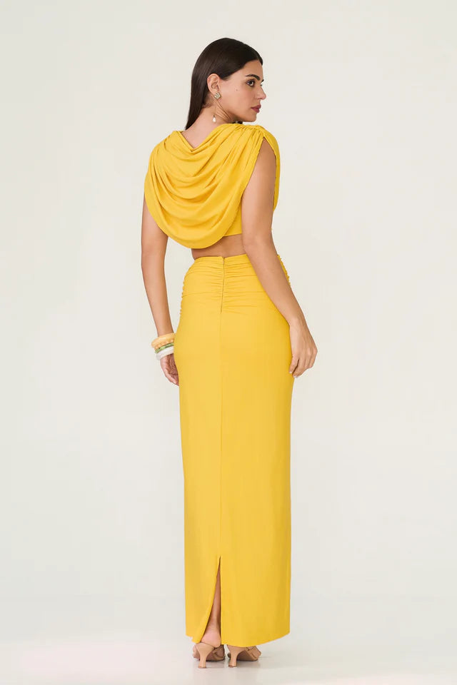 Jenny skirt is a yellow maxi skirt with horizontal ruching throughout for a figure-flattering silhouette. The high-waisted fit and bodycon construction create elegant lines, while the floor-length design adds drama and sophistication