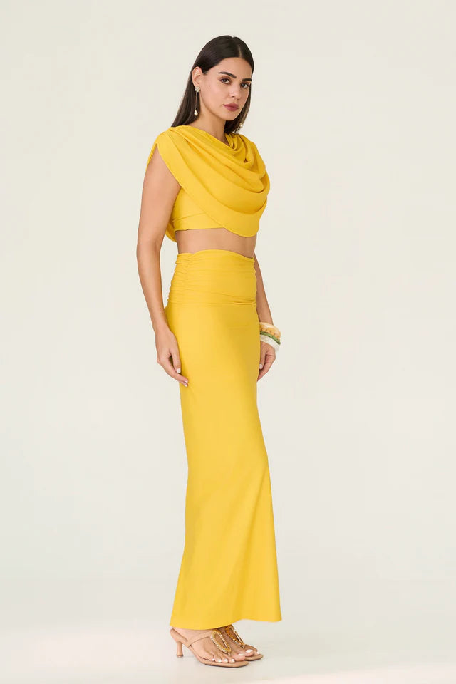 Jenny top is a yellow sleeveless top featuring an elegant draped cowl neckline for effortless sophistication. The cap sleeves and relaxed fit through the bodice create comfortable elegance, while the luxe fabric drapes beautifully