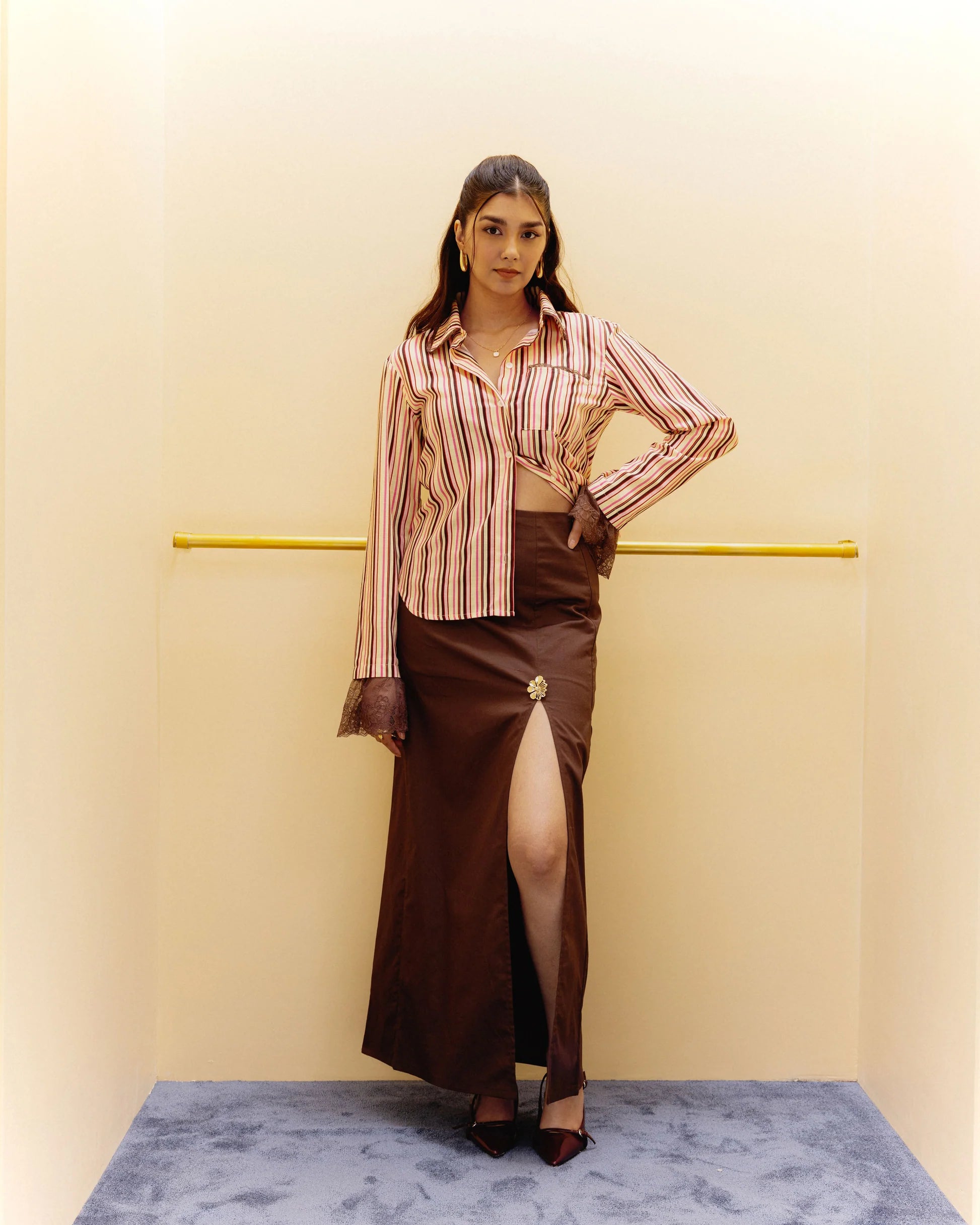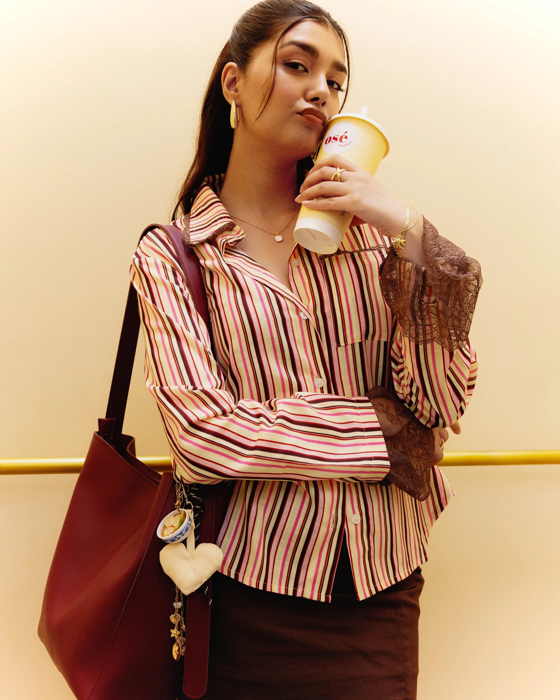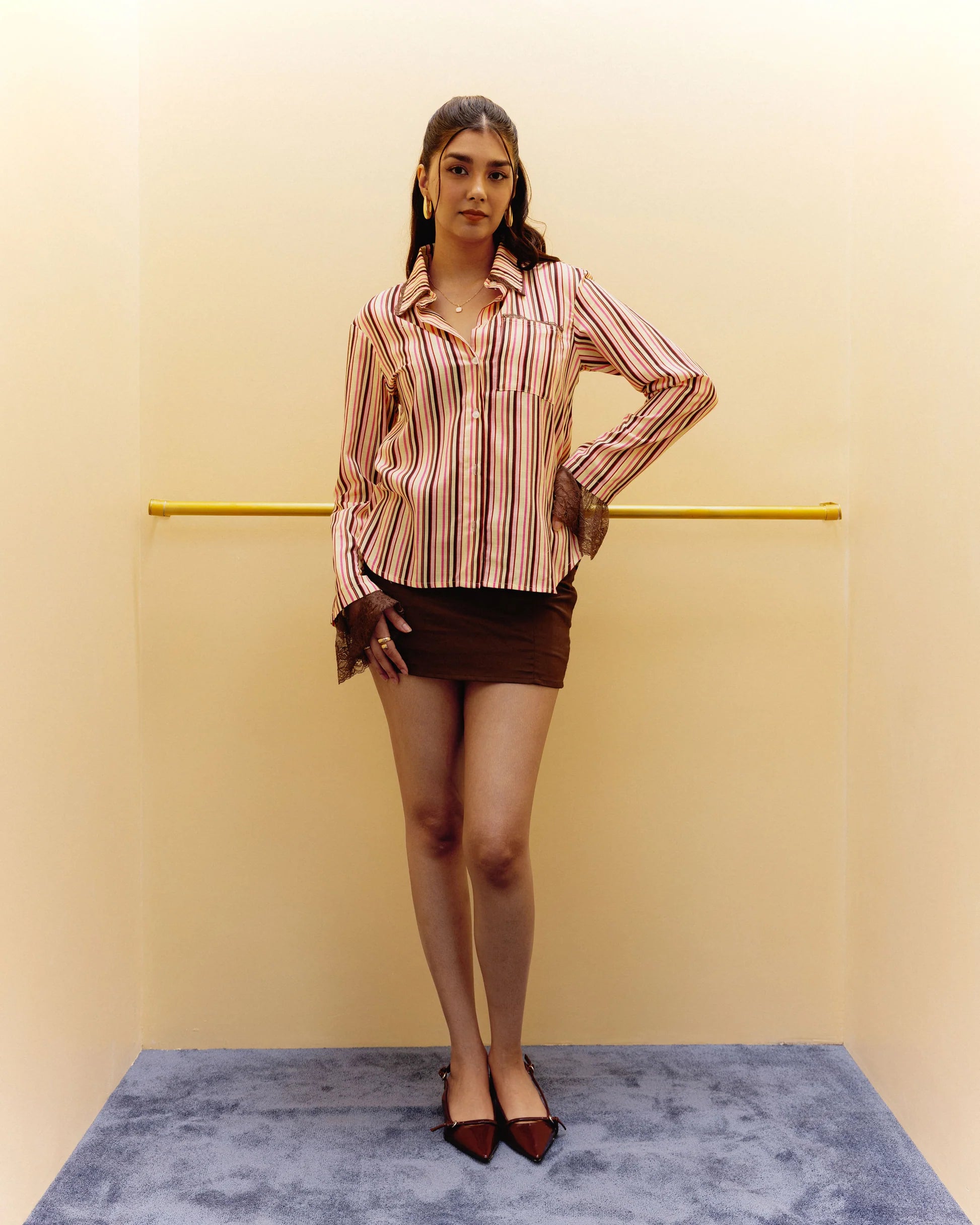 A breezy powder-blue shirt with flared sleeves finished in soft white lace. Easy, airy, and effortlessly chic because sometimes logging out is the best look.