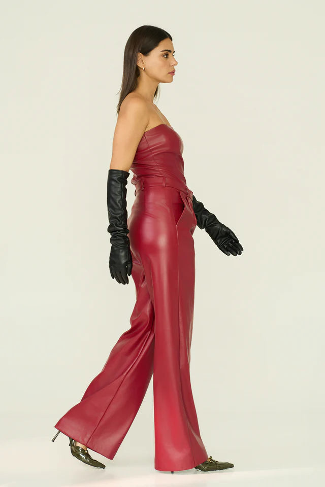 This Muse top is an Edgy burgundy faux leather tube top with a sleek strapless design for bold, contemporary style. The structured fit with subtle sheen and stretch fabric creates a comfortable yet chic look
