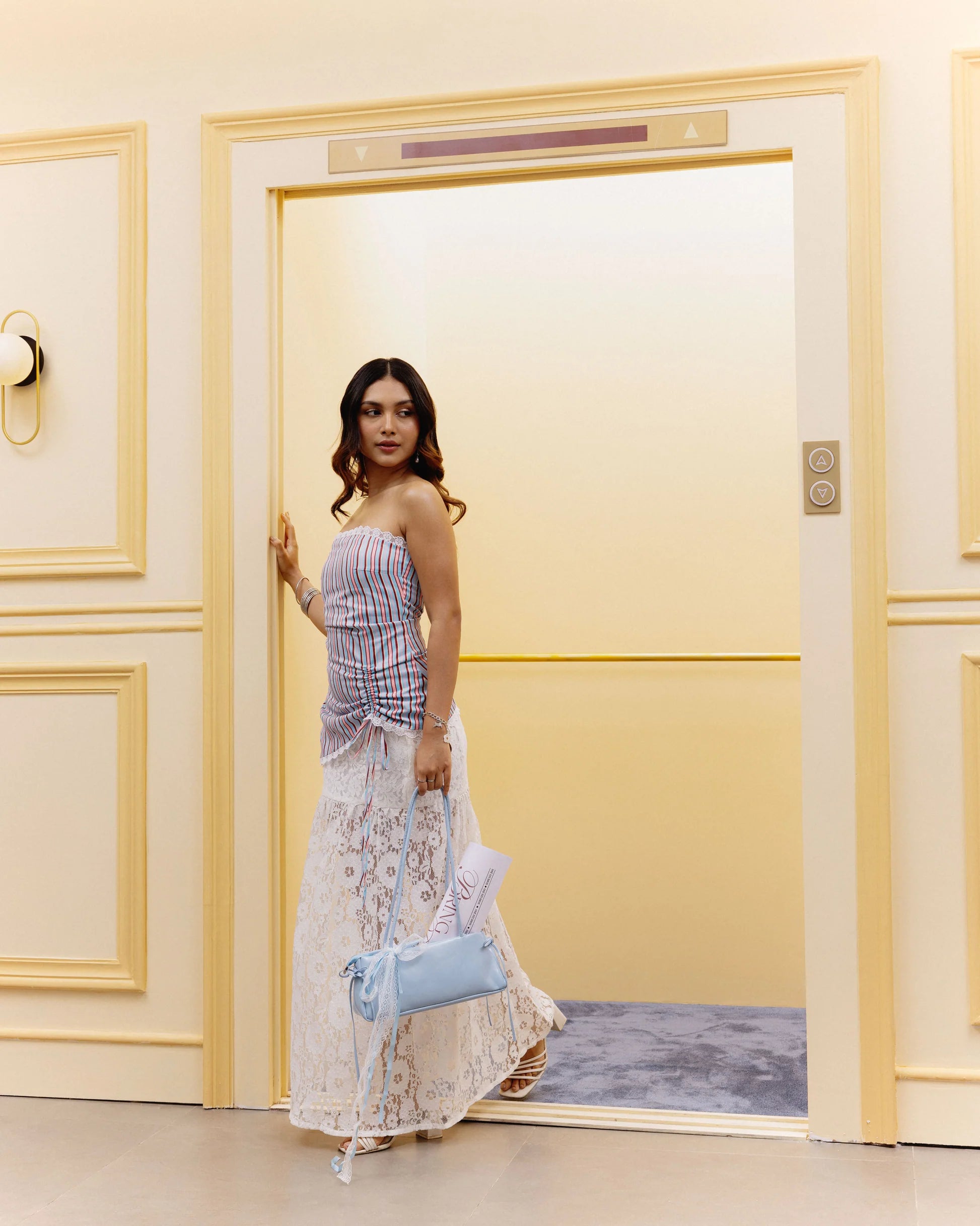 A fun striped corset top combined with a flowing lace skirt, perfect for those moments when your thoughts are on holiday even if your emails aren’t. Chic, feminine, and with a hint of sass, this coordinated set lets you carry the vacation vibe wherever you go.