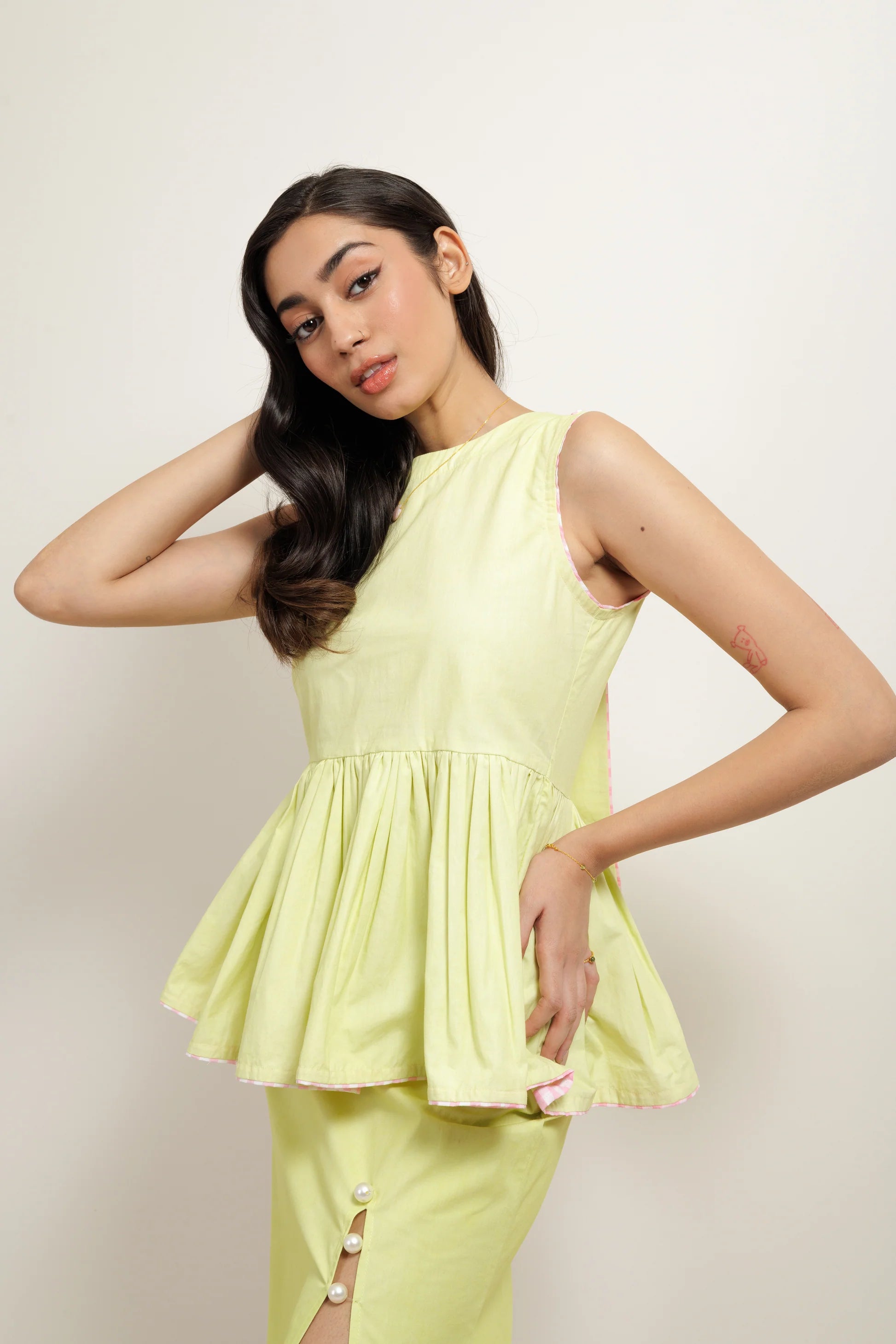 Designed to flatter, the peplum silhouette accentuates your curves while providing a playful flair. The cute bow detailing on the back adds a touch of whimsy and femininity, making it perfect for any occasion, whether it's a casual outing with friends or a romantic dinner date