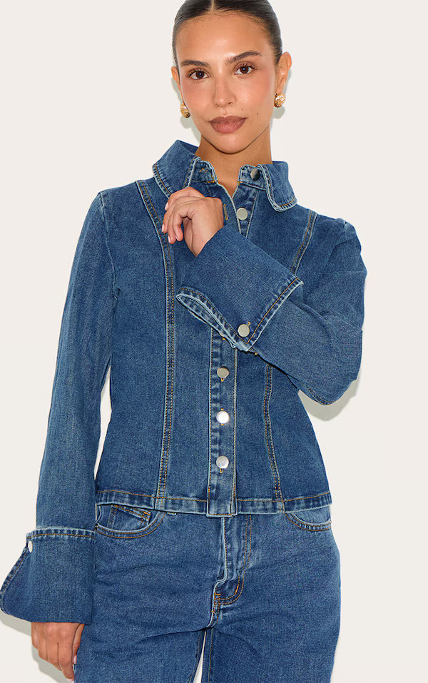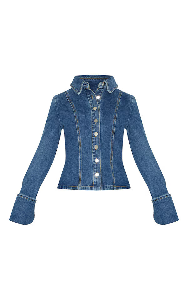 Finished with intricate detailing, this fitted shirt is made from light blue denim with flared sleeves, a structured collar and button fastenings.