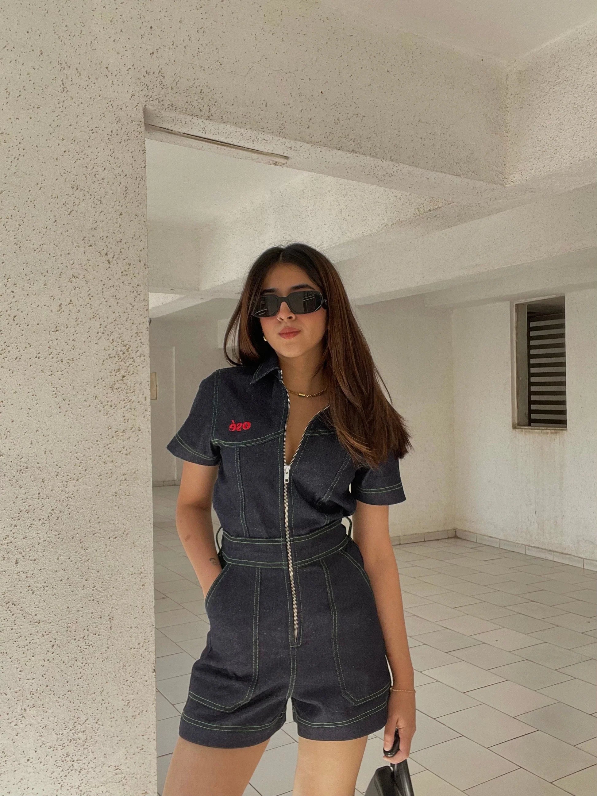 Introducing our classic denim romper, perfect for those who love a touch of vintage in their wardrobe. This romper is designed with a zip-up front detail and green topstitching to make it unique. It also features pockets, adding practicality to this stylish piece. Made with high quality denim, it's both durable and comfortable. Whether you dress it up with heels or dress it down with sneakers, this romper is perfect for any occasion. Upgrade your wardrobe with this timeless piece today.