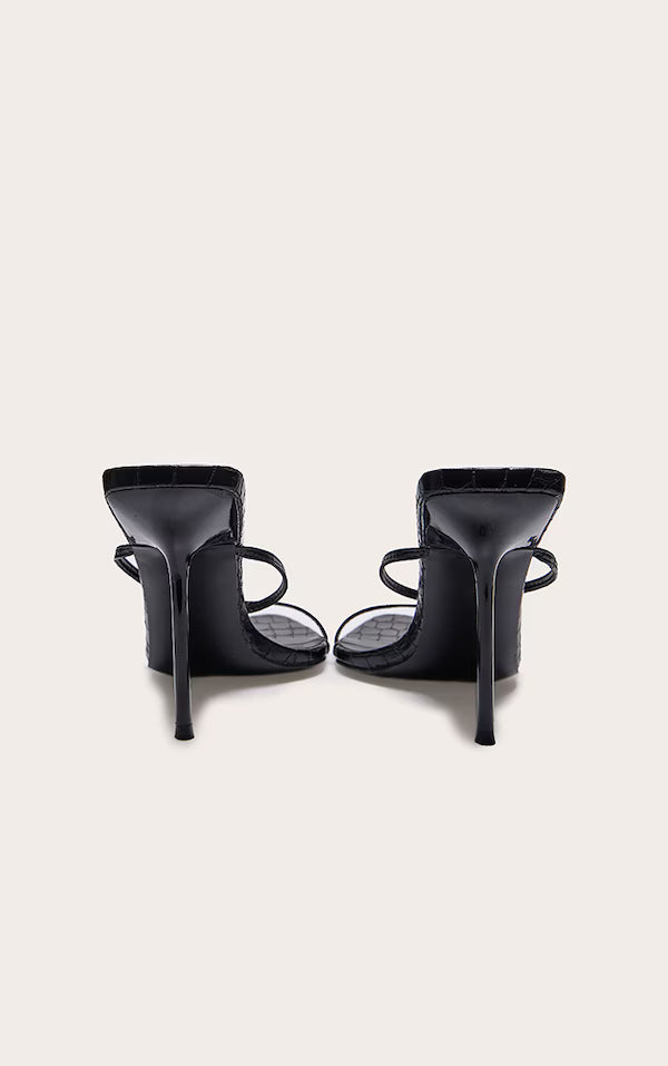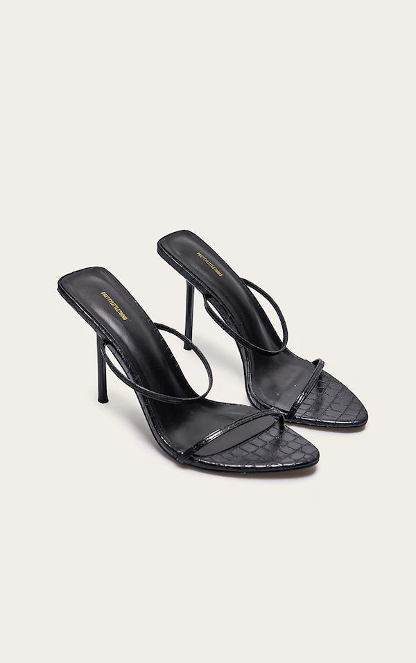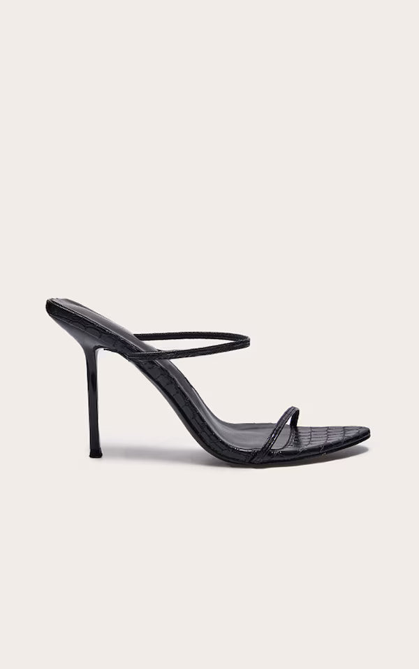 The enduring appeal of a point toe heel, reimagined. These black croc-embossed, faux leather stilettos offer a masterclass in minimalist design, proving that less truly is more. The barely-there silhouette elegantly elongates the leg, while the textured finish lends a considered edge. Ground sleek tailoring, add a considered counterpoint to denim, or elevate your after-dark ensemble.
