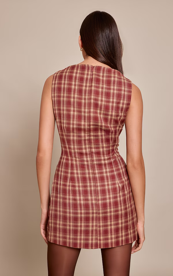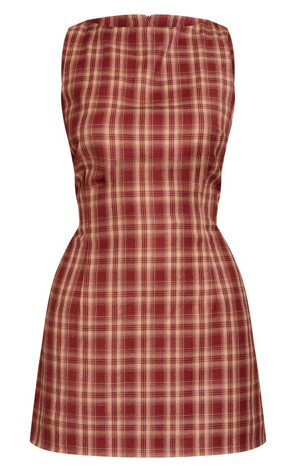 Redefine your daywear with the red check boat neck sleeveless shift dress. Brought to you in a bold red check, this dress features a contemporary boat neckline and a flattering shift silhouette. Perfect for those casual weekend plans or effortlessly chic office days. Complete the look with some sleek brown heels and understated gold earrings for a polished finish.