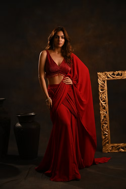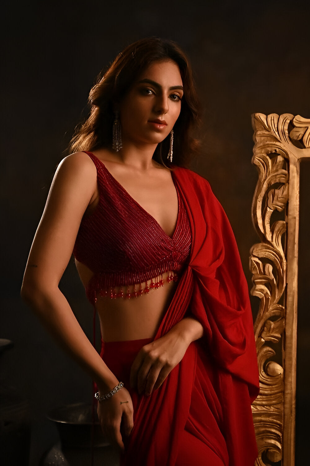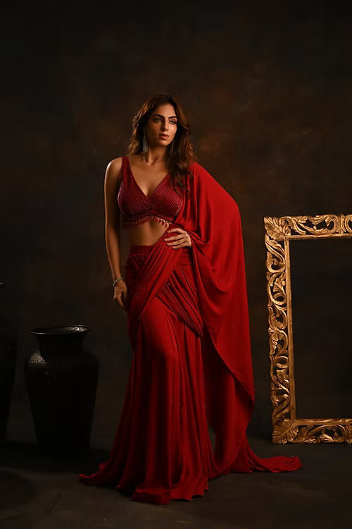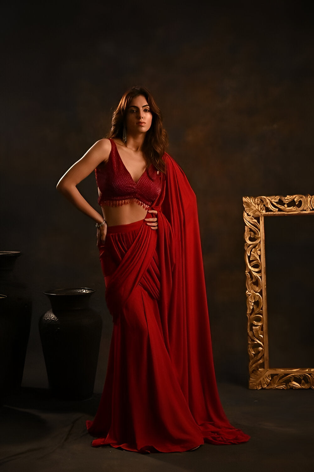 Red fish cut pre-draped saree with a pleated palla, hand-embellished blouse, and embellishments on the waist.
