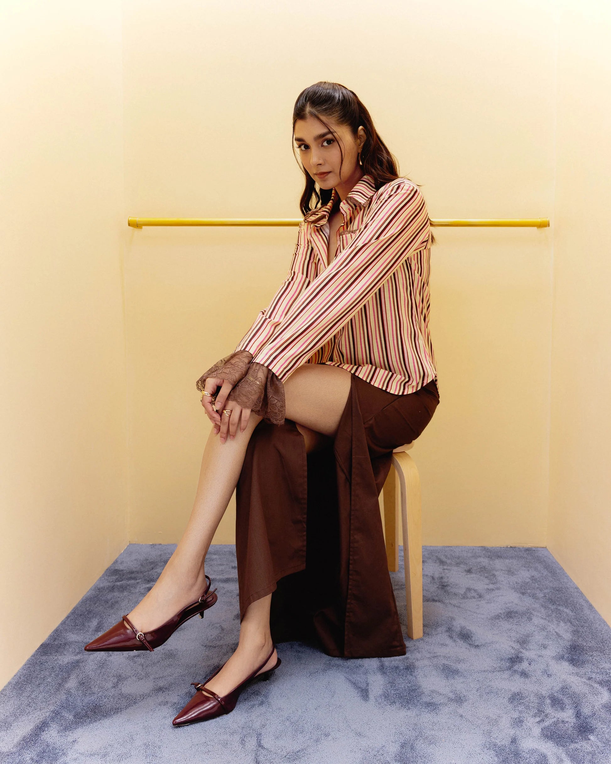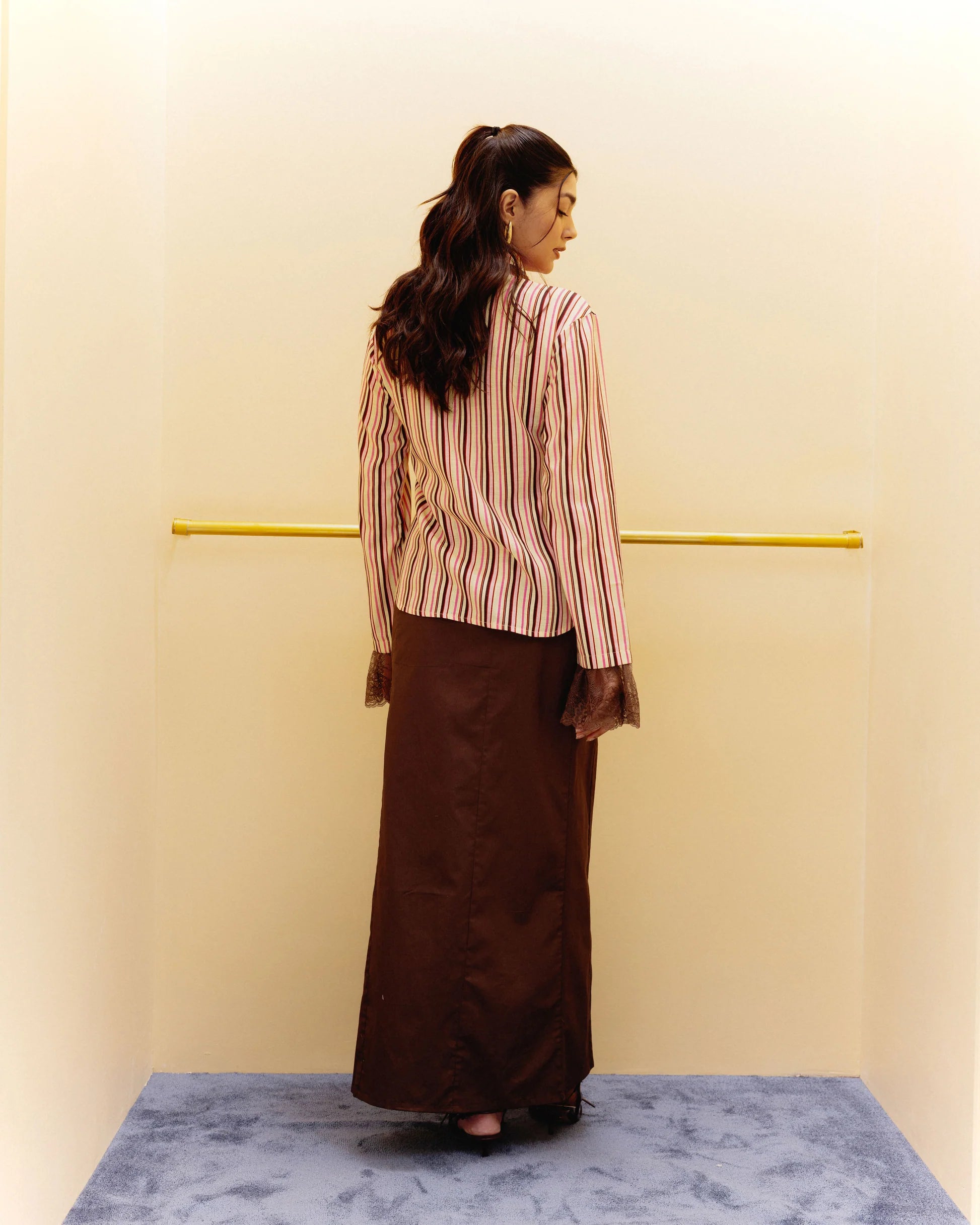 Part of the Bring the Holiday Back collection. A rich brown skirt with a golden broach and a striking slit. Effortless, bold, and made for those who live for the moment