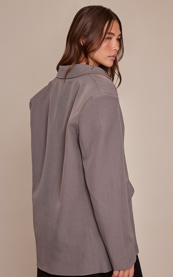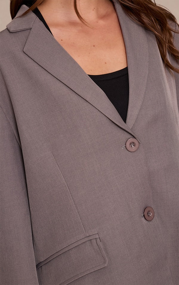 Define your day look with assertive confidence. The stone oversized blazer offers an effortlessly cool silhouette, cut with sharp notched lapels that frame a deep V-neckline, flowing into a single-button fastening designed for versatile layering. Its clean lines are complete with practical flap pockets, blending a utilitarian edge with a refined polish. For an elevated daytime aesthetic, style this essential outerwear with tailored wide-leg trousers and a crisp camisole, then complete the ensemble with elegant court heels and subtle gold earrings to truly own the room.