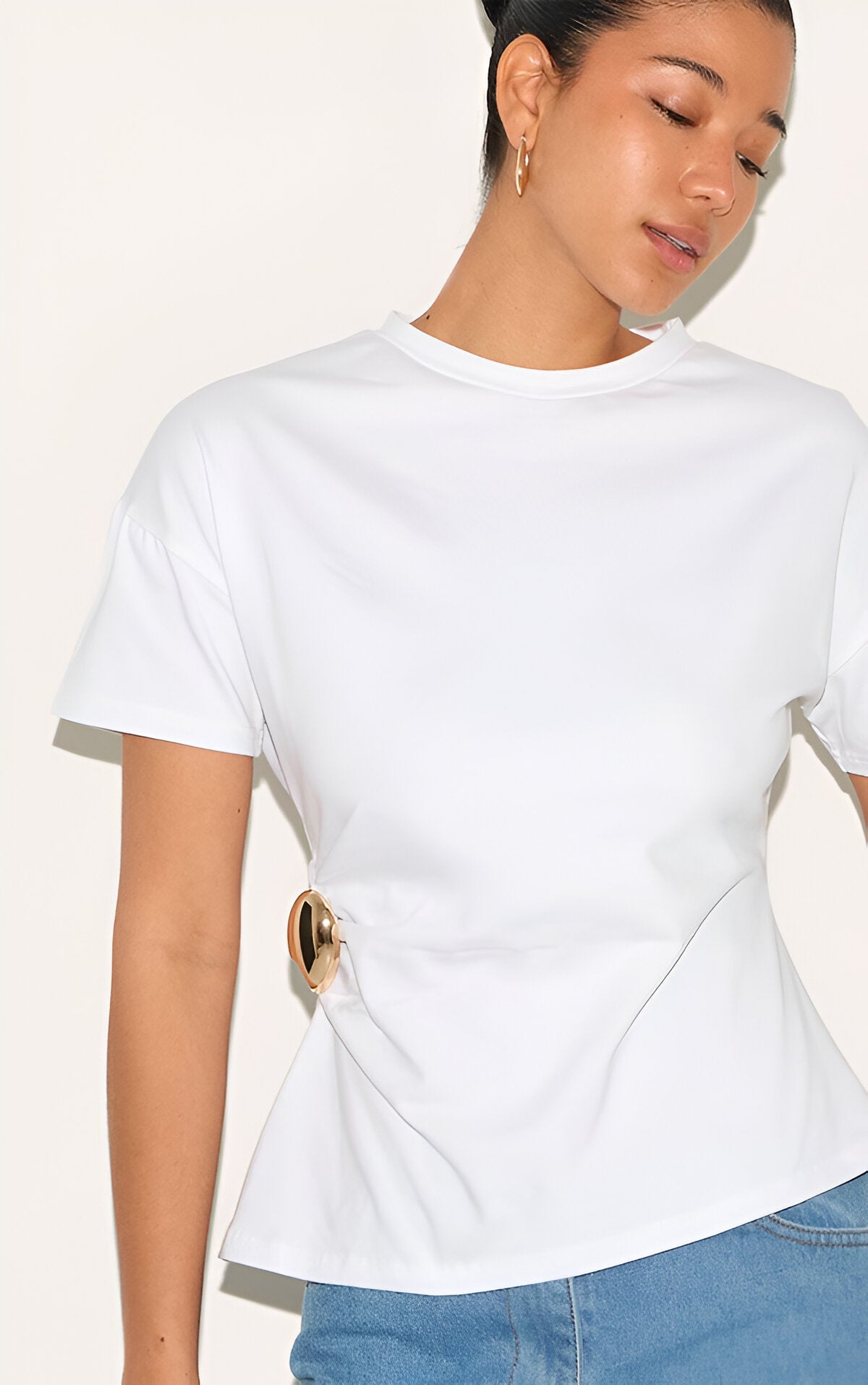Experiment with angles in this asymmetric hem T-shirt that brings an edge to the classics. Made in black fabric with contrast trim and a directional hemline. Style with wide-leg pants and heels for an elevated off-duty outfit.