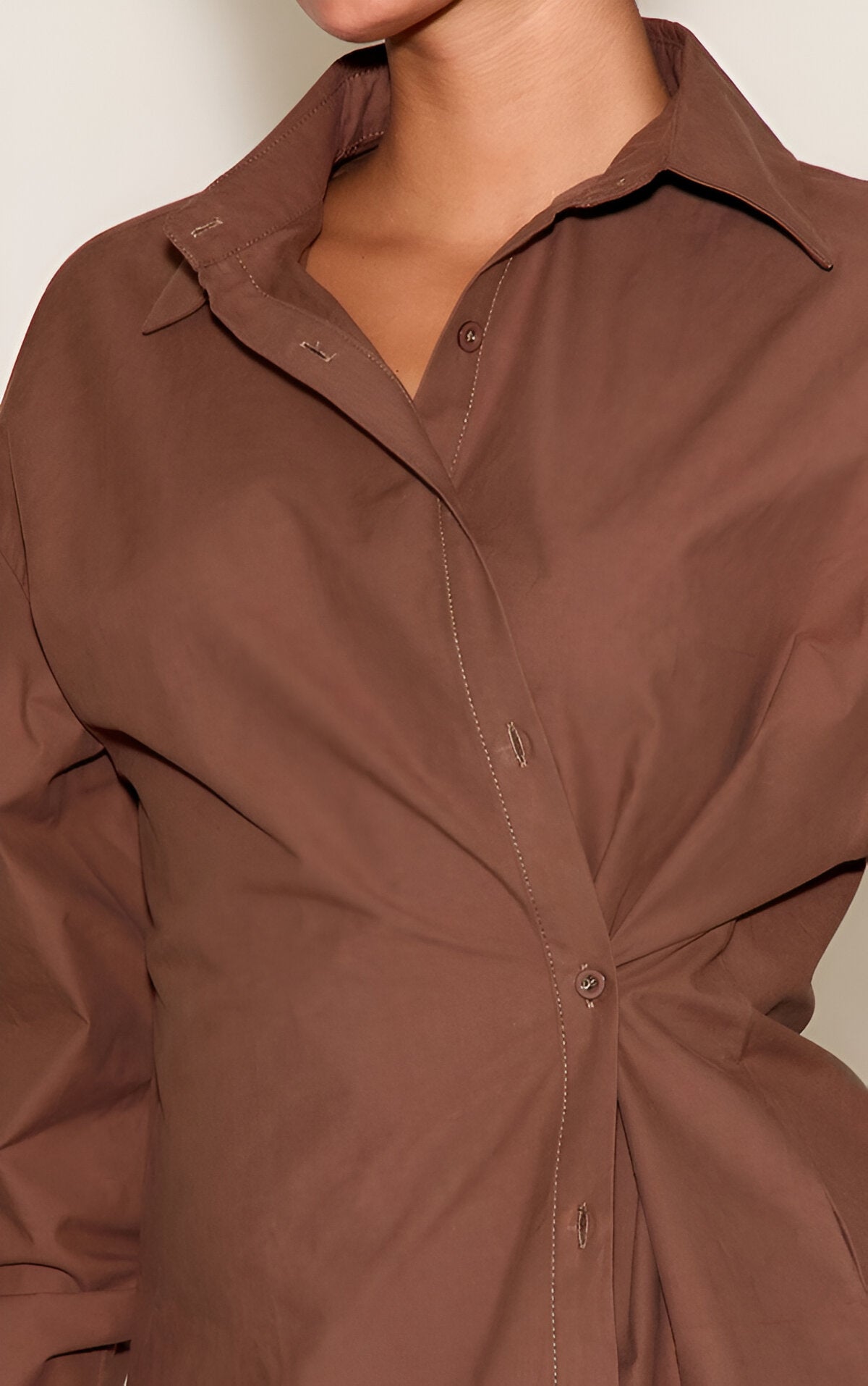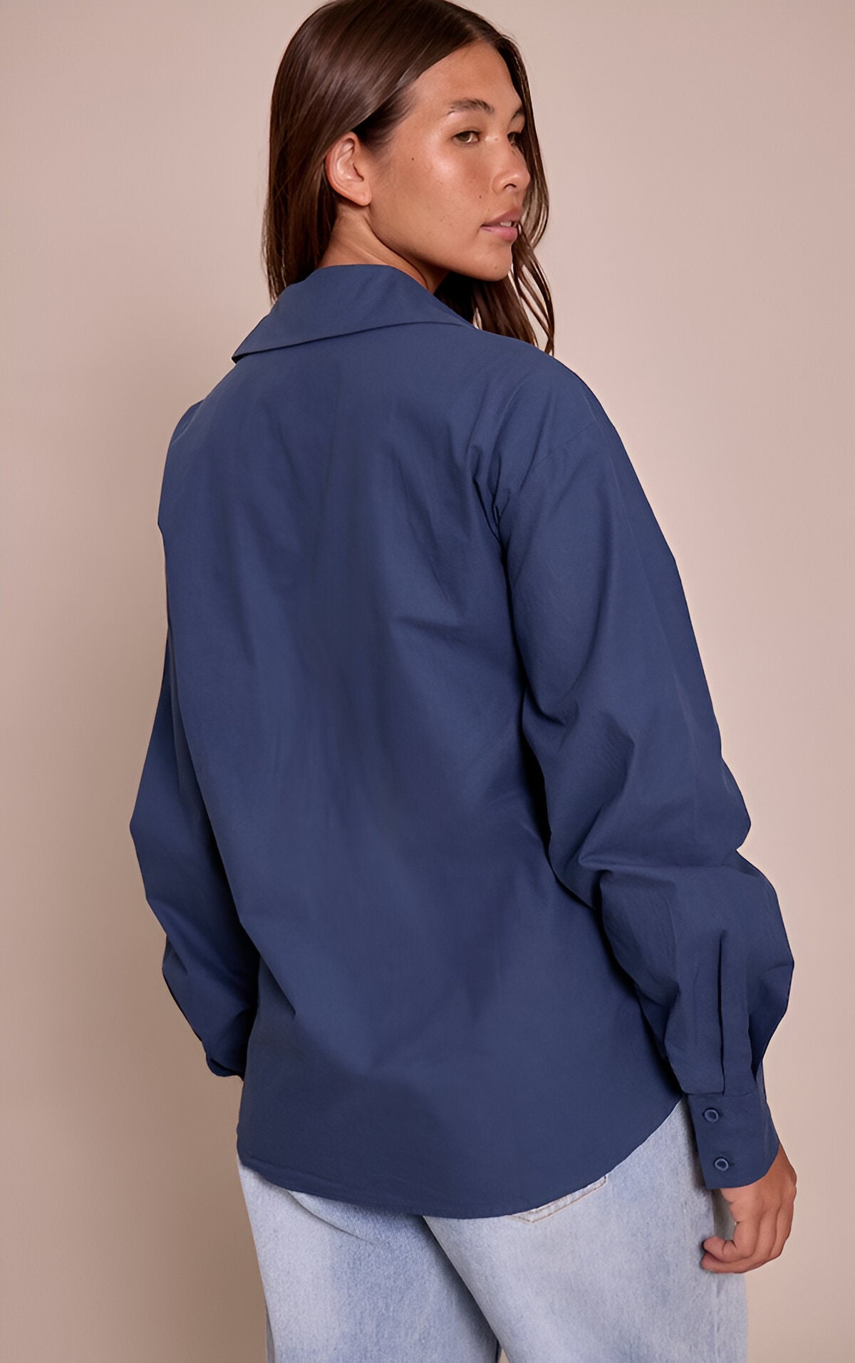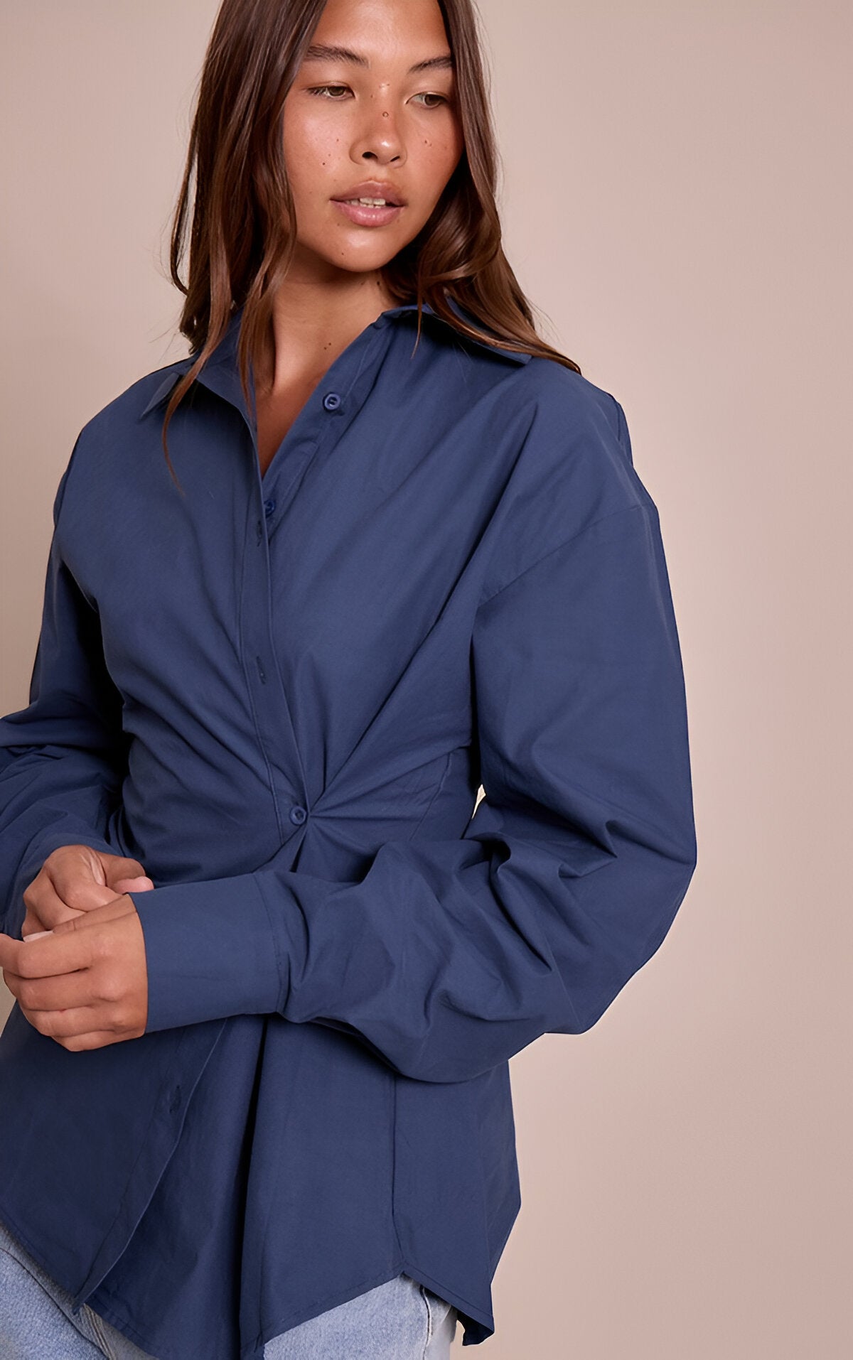 Opt for structured chic with the navy cotton multi button cinched shirt. Made from crisp navy cotton with multi-button details and a cinched waist, it delivers a sharp, feminine silhouette. Pair with straight-leg jeans and slip-on heels for an effortlessly polished vibe.