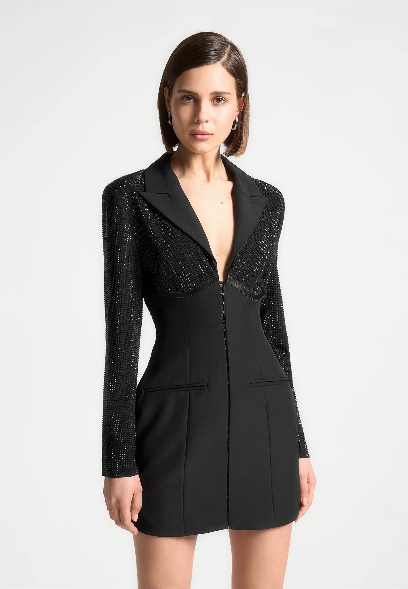 The perfect night out dress. Not only are the rhinestones a standout feature, the shoulder padding combined with the corset-style fastening create a flattering hourglass silhouette.