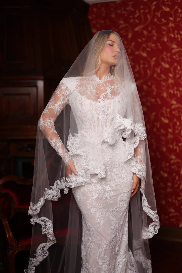 Elegant body veil crafted from delicate tulle with refined lace edging. Designed to flow gracefully along the body, creating a soft siren-inspired silhouette that adds sensual elegance and timeless beauty.