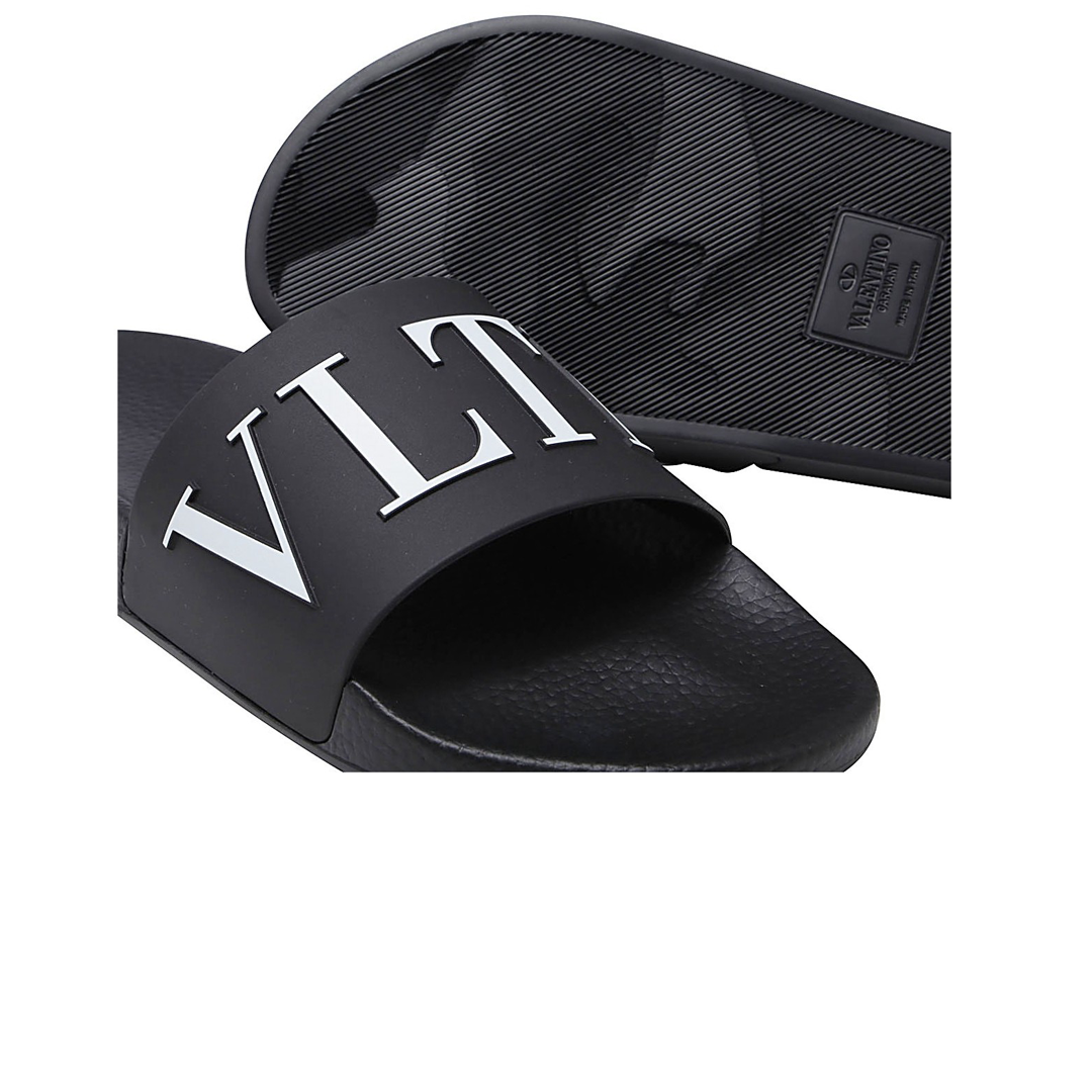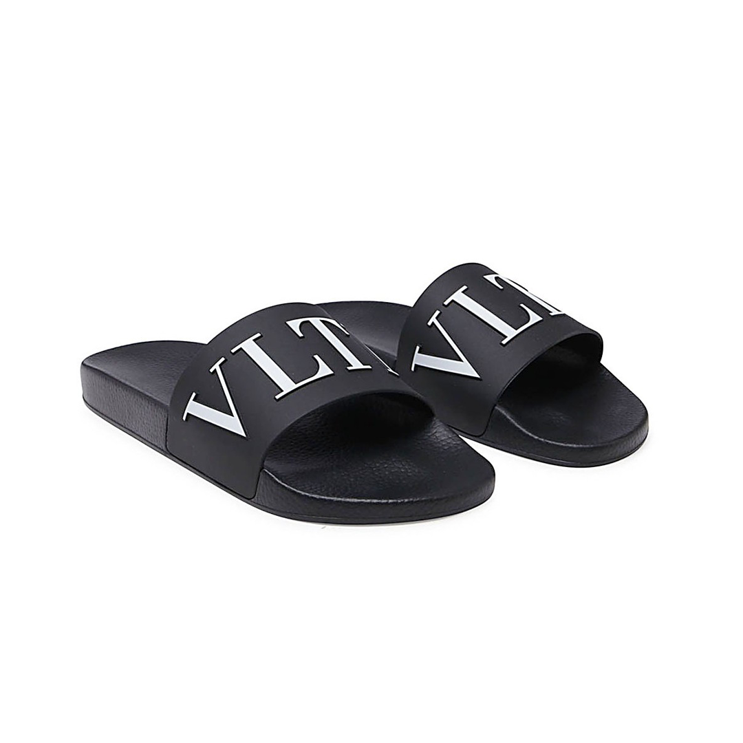 Black rubber VLTN print slides from VALENTINO GARAVANI featuring open toe, flat rubber sole and signature VLTN print.