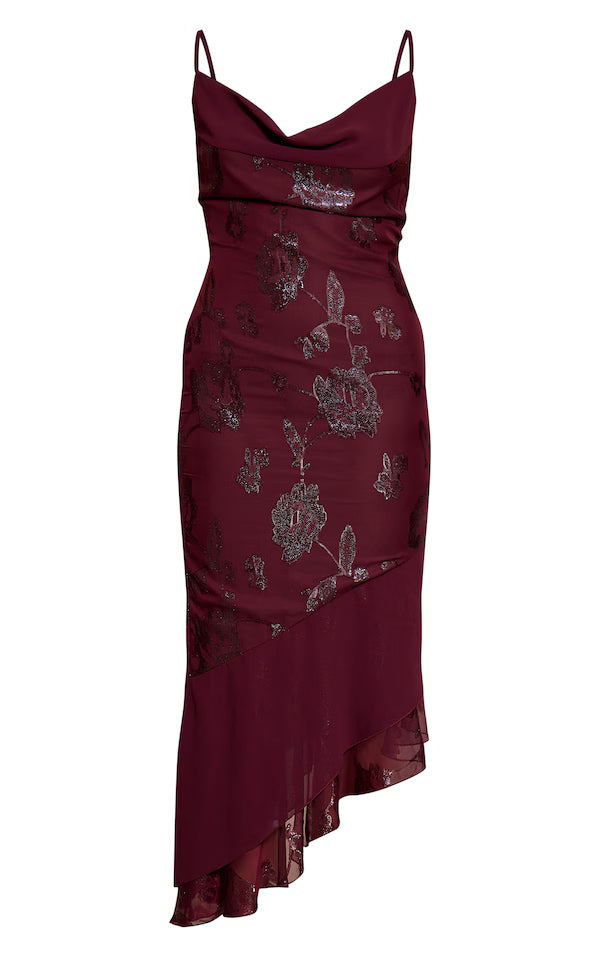 Step into the spotlight with an air of effortless charm in the wine chiffon floral detail midaxi dress, a piece designed to command attention. This captivating slip dress showcases a sophisticated cowl neckline and delicate spaghetti straps, leading into a midaxi silhouette that's artfully defined by an asymmetric ruffled hem, ensuring graceful movement. The subtle floral detailing woven through the fabric adds an intricate, light-catching dimension. Complete this refined evening look with sleek black platform heels and striking drop earrings, solidifying your presence with an undeniable sense of style.