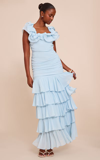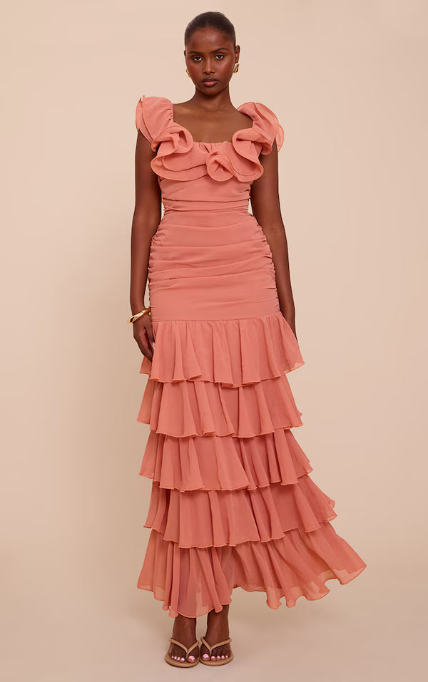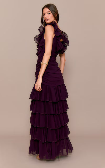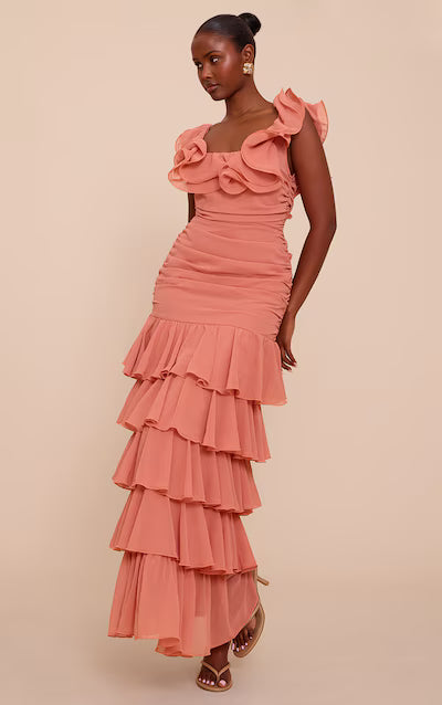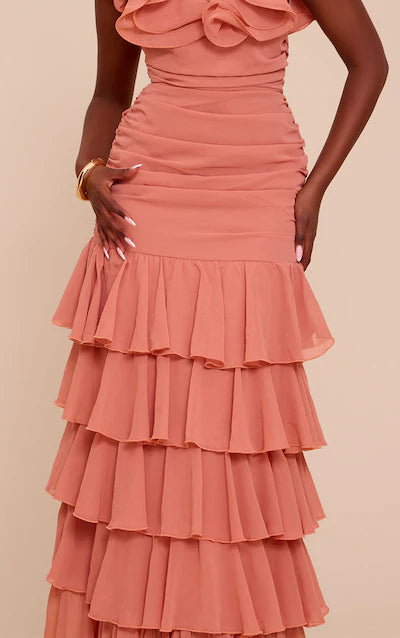 Chiffon Ruched Ruffle Maxi Dress