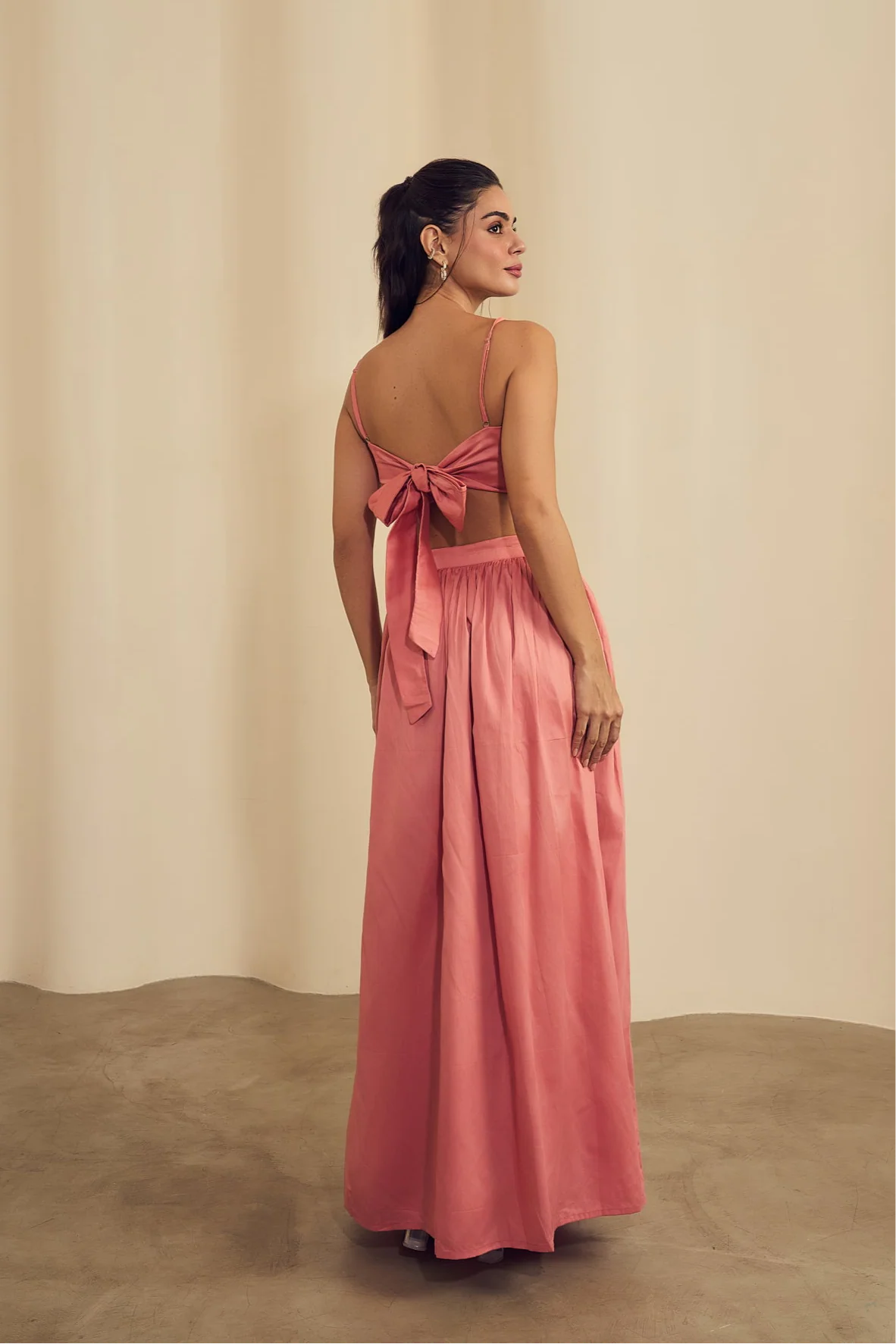 The Zoha high-waisted maxi skirt in a minimalist peach shade features a flared silhouette. Combining comfort with sophistication, it is an excellent choice for summer gatherings or casual occasions.